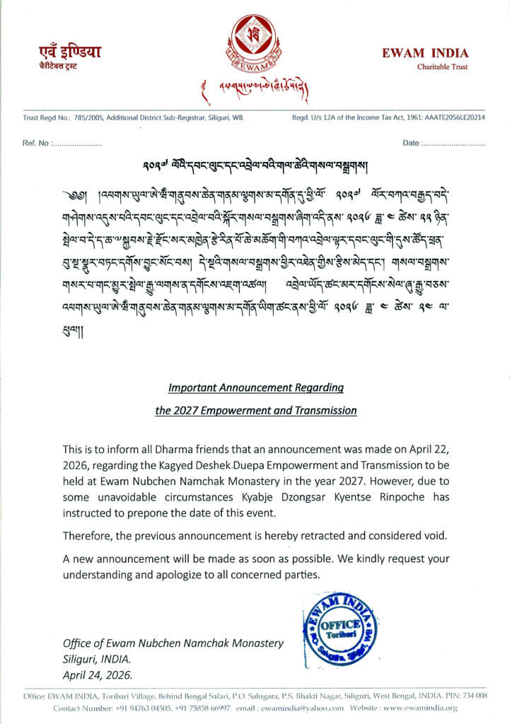 Ewam India Charitable Trust is a religious, social & educational non-profit organization established on 16th May 2005 under the spiritual guidance of H. E. Gochen Tulku Sang-ngag Tenzin Rinpoche who is the founder and spiritual director of Ewam International Centers around the world. The Trust is registered under Indian Trust Act, 1882 at Additional District Sub-Registrar, Siliguri, Government of West Bengal and also under section 12AB of the Income Tax Act 1961. The Trust’s registered office is at Toribari village, P.O. Salugara, Siliguri, West Bengal
