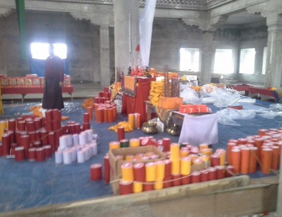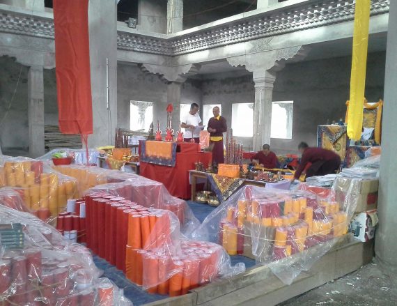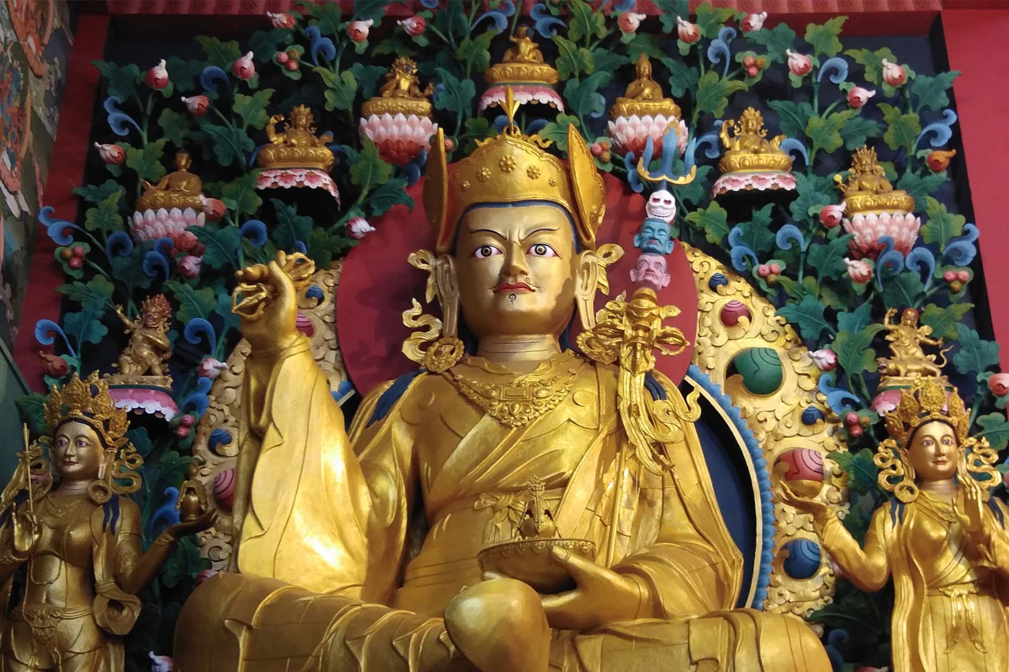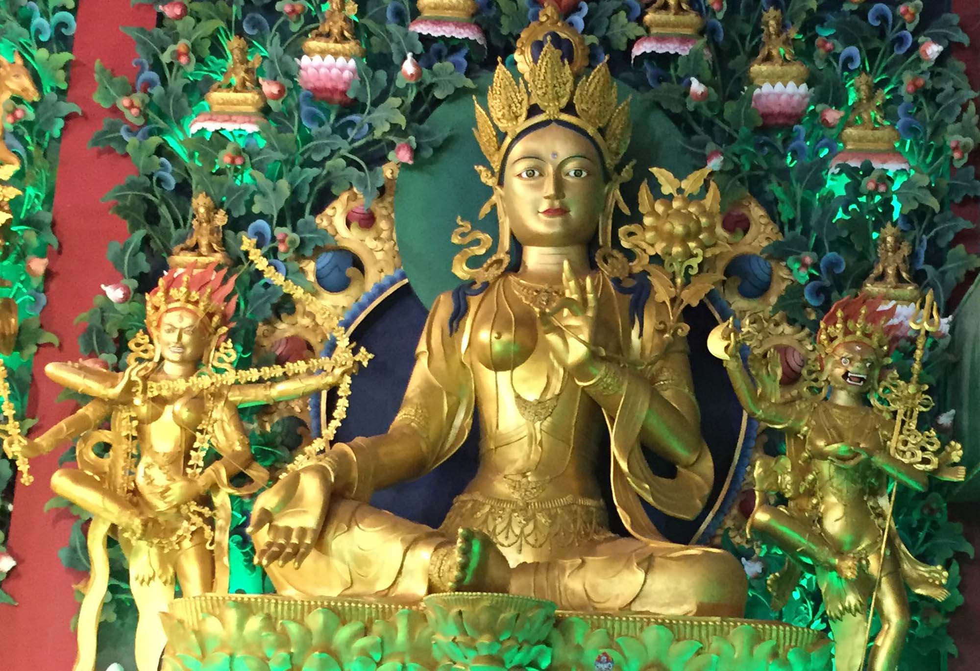On the left side is the palace of Jambhala, named Gödöd Künjung Ling (“Place of the Source of All that is Needed and Wanted”). The main statue of this chamber is the three-foot-high statue of Pema Gyelpo, the wealth deity aspect of Orygen.