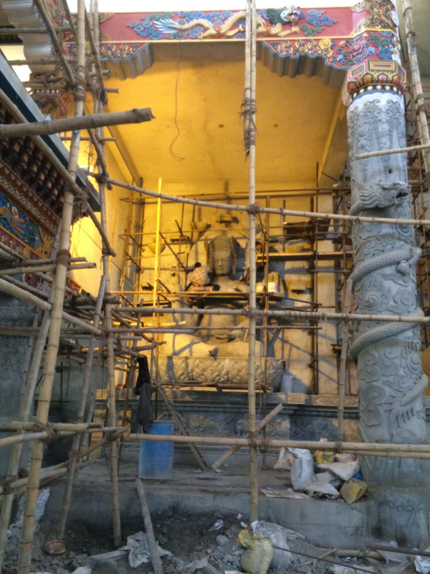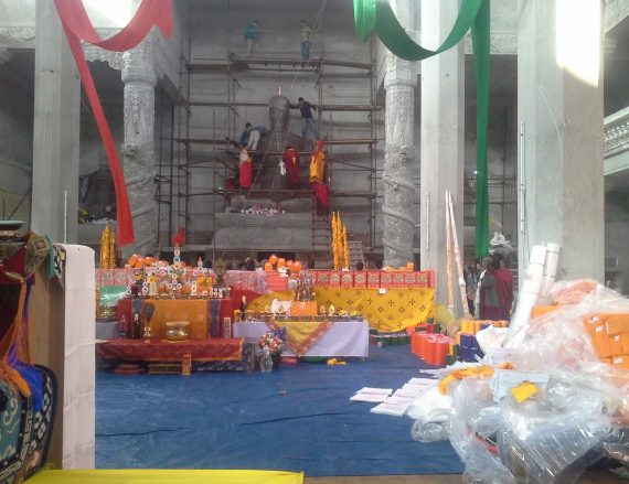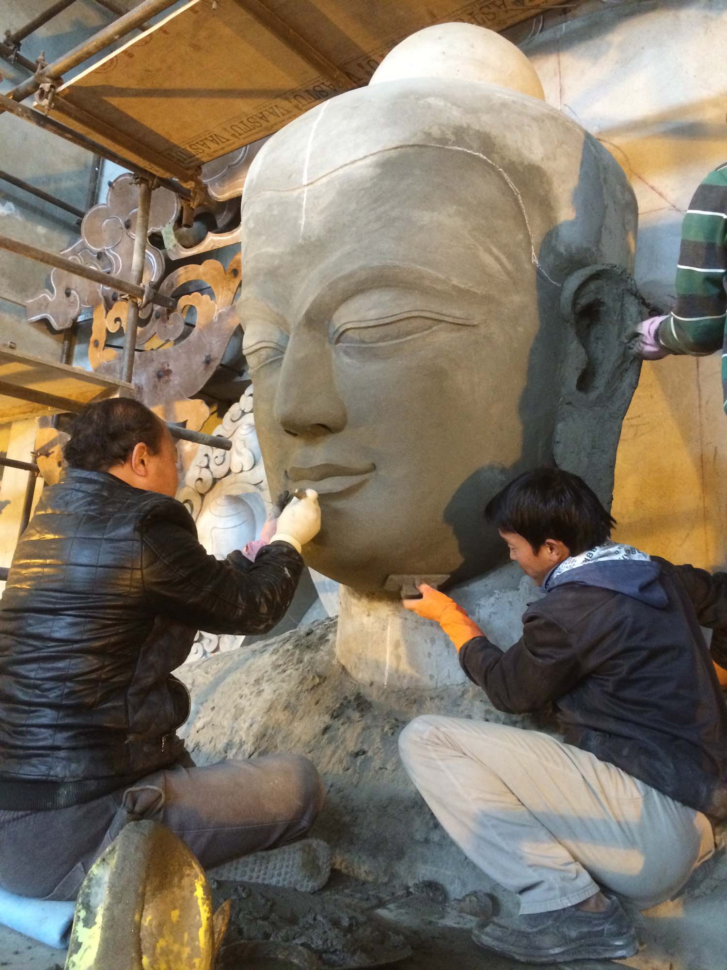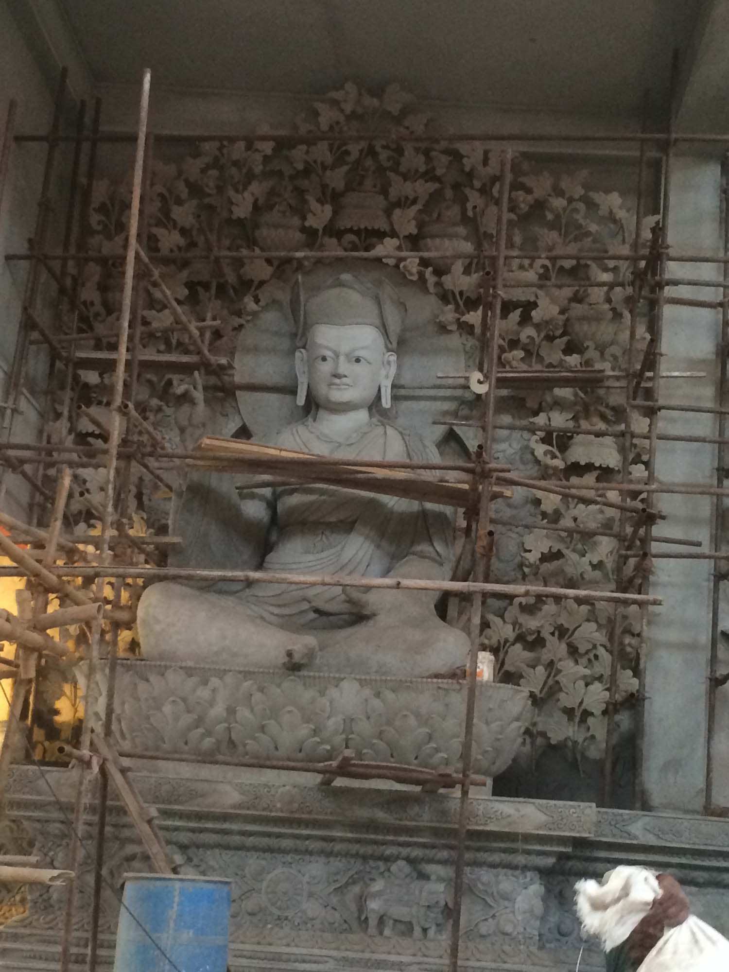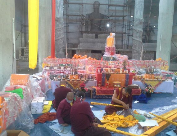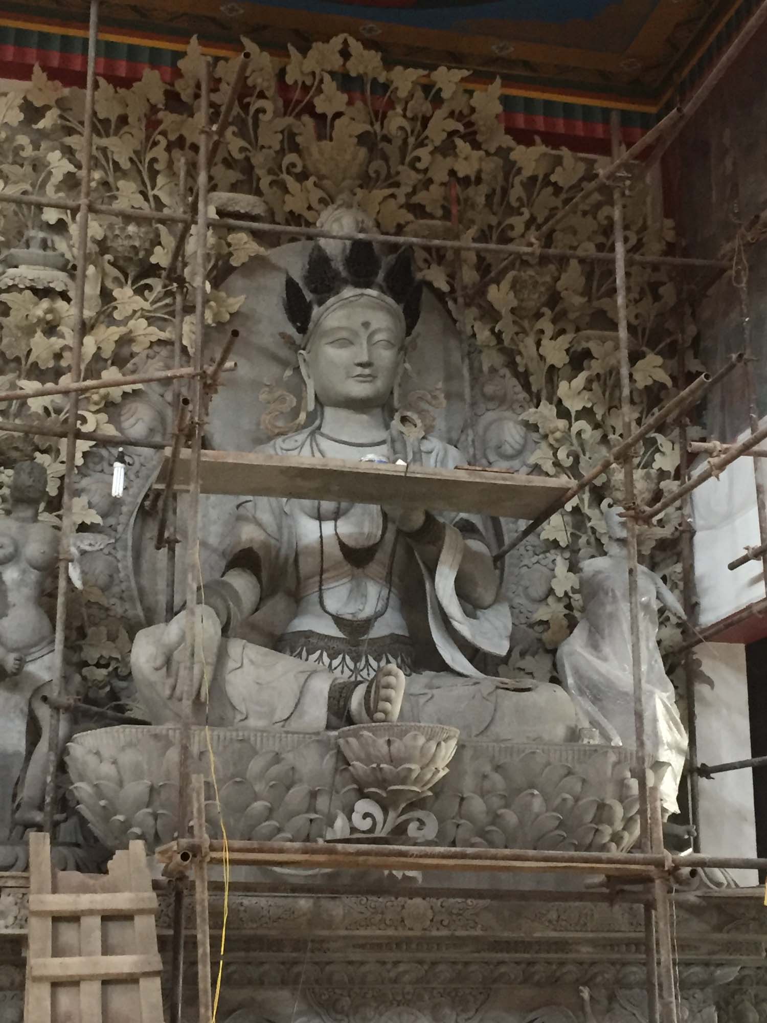 At the most center of the temple rises a 38-foot statue of the master of the teachings—the Teacher, the perfect Buddha—surrounded by the seven successive generations of buddhas. To his right and left, respectively, are nine-foot-high statues of Mañjushri (the lord of sublime wisdom) and the Lord of Secrets Vajrapani (the lord of spiritual power and might). These make up the main three figures, the central one and retinue.
