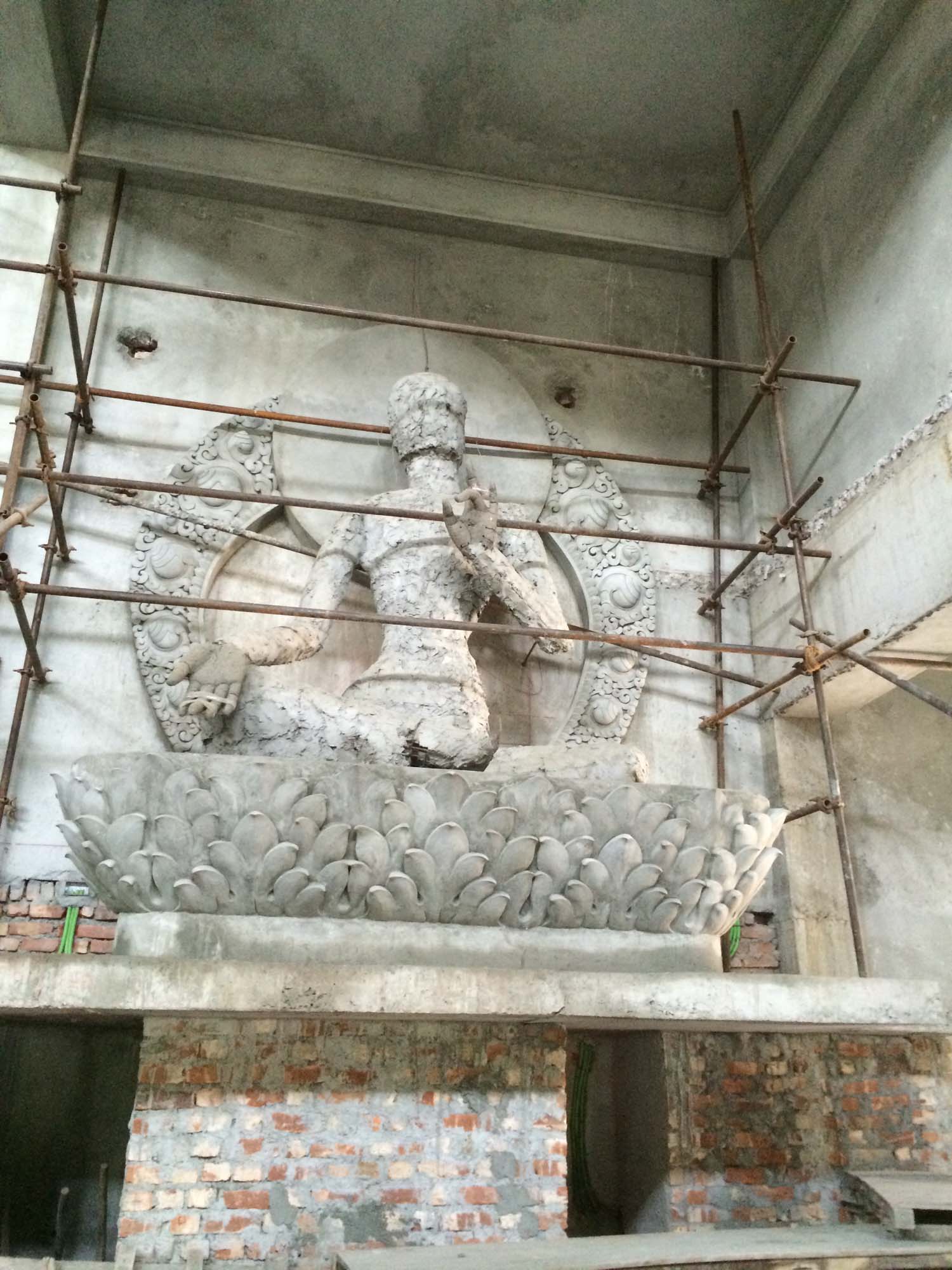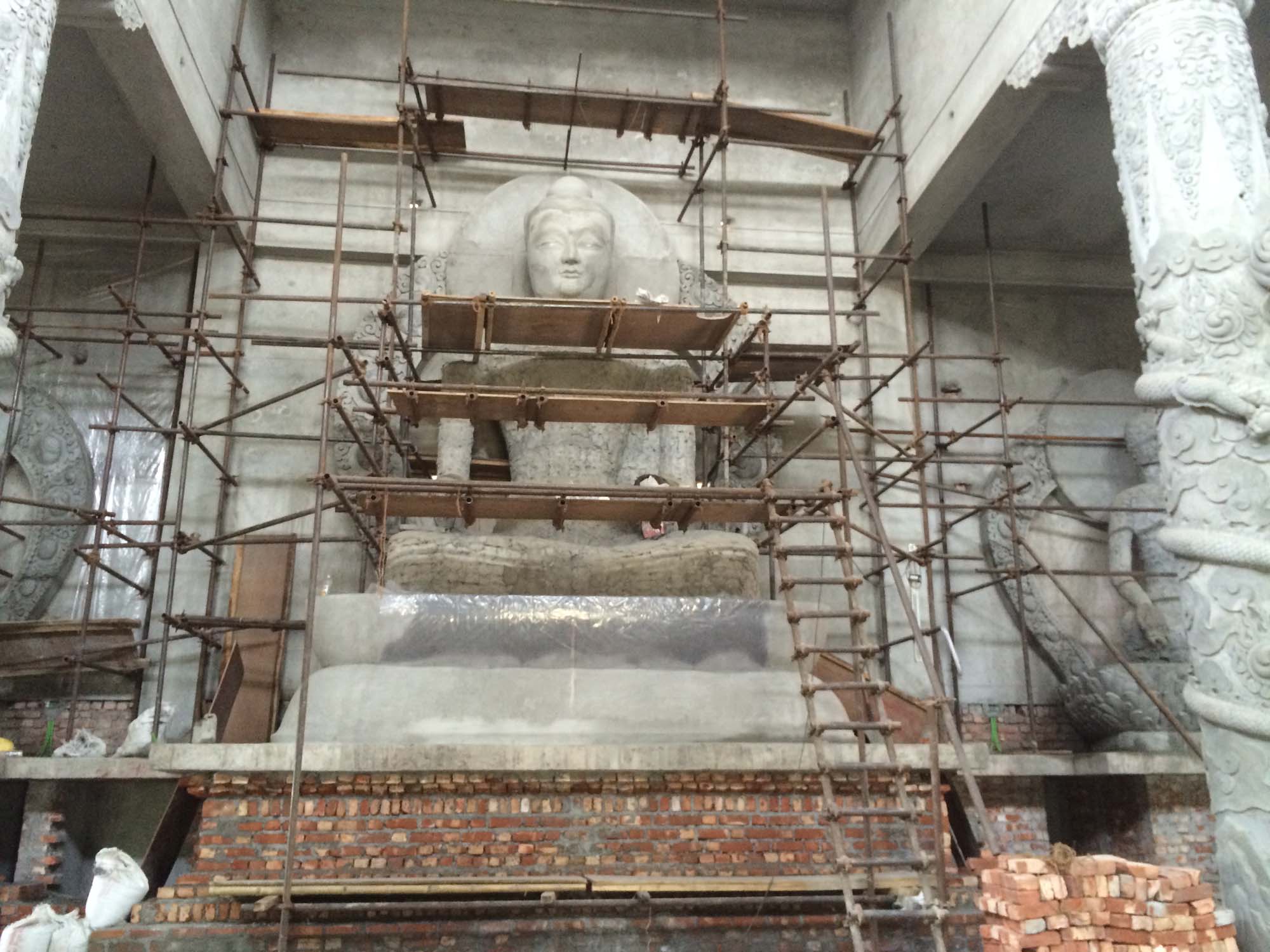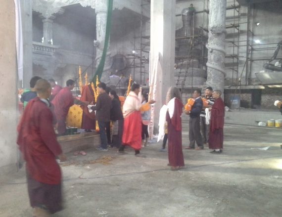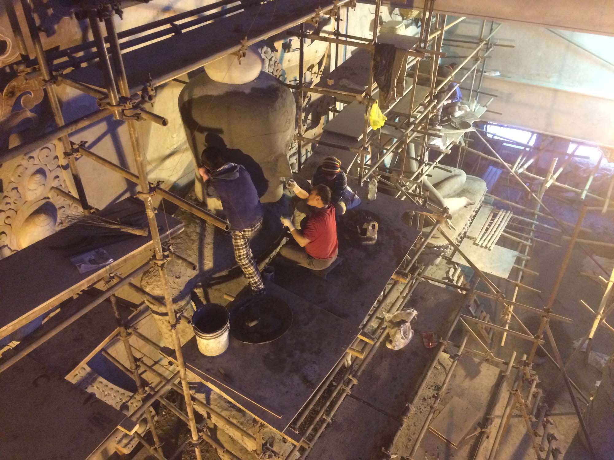 At the most center of the temple rises a 38-foot statue of the master of the teachings—the Teacher, the perfect Buddha—surrounded by the seven successive generations of buddhas. To his right and left, respectively, are nine-foot-high statues of Mañjushri (the lord of sublime wisdom) and the Lord of Secrets Vajrapani (the lord of spiritual power and might). These make up the main three figures, the central one and retinue.