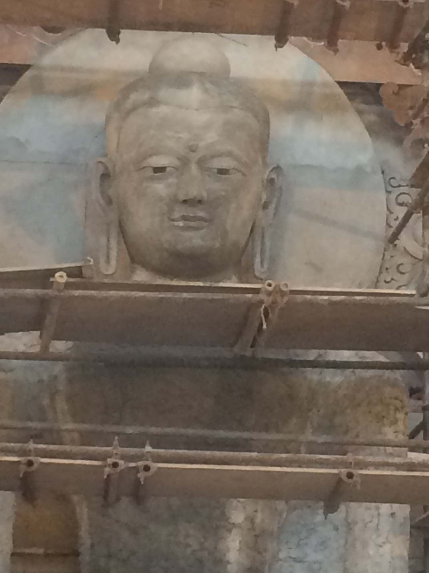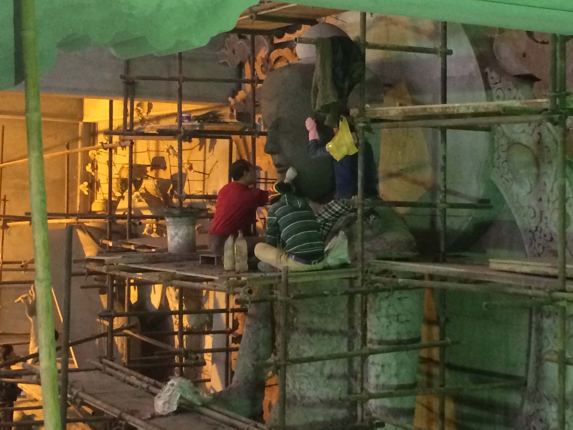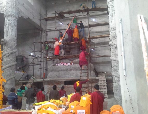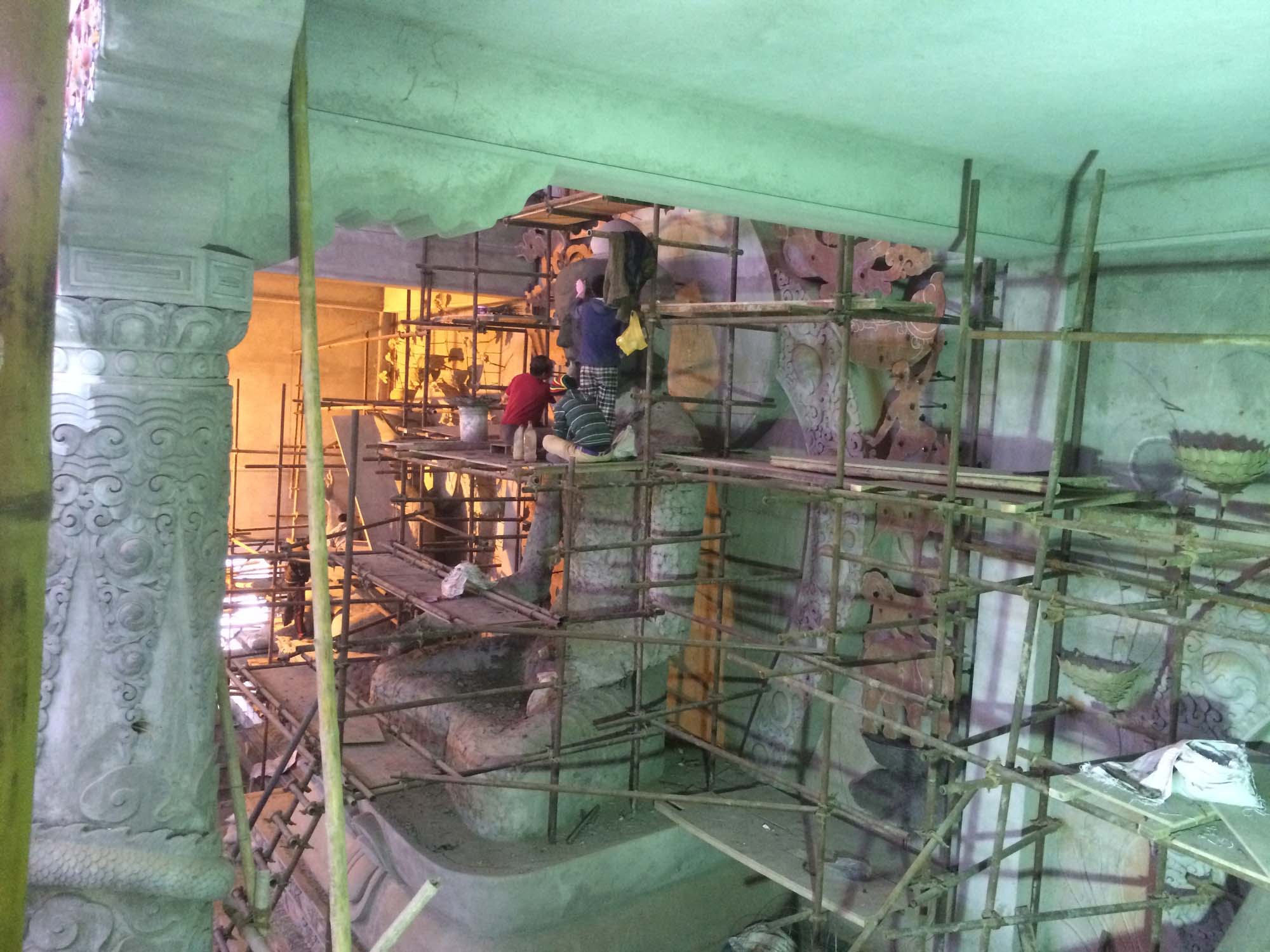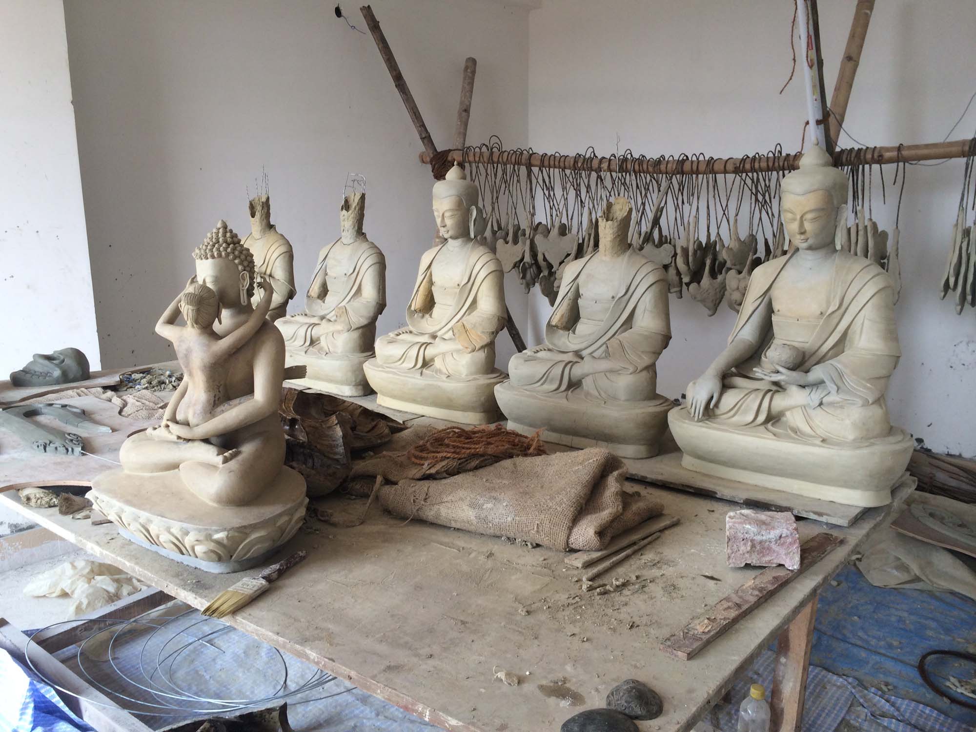 At the most center of the temple rises a 38-foot statue of the master of the teachings—the Teacher, the perfect Buddha—surrounded by the seven successive generations of buddhas. To his right and left, respectively, are nine-foot-high statues of Mañjushri (the lord of sublime wisdom) and the Lord of Secrets Vajrapani (the lord of spiritual power and might). These make up the main three figures, the central one and retinue.