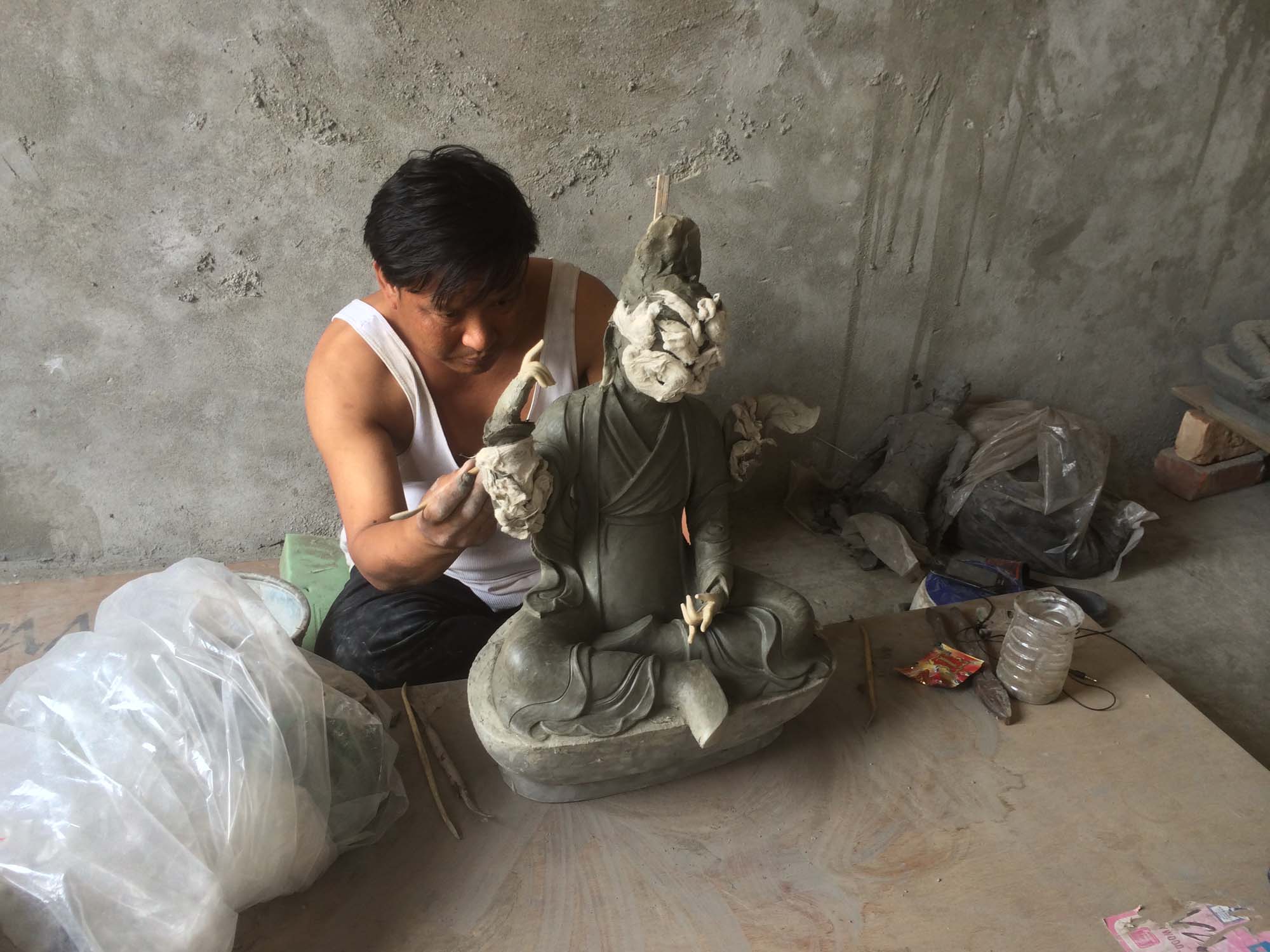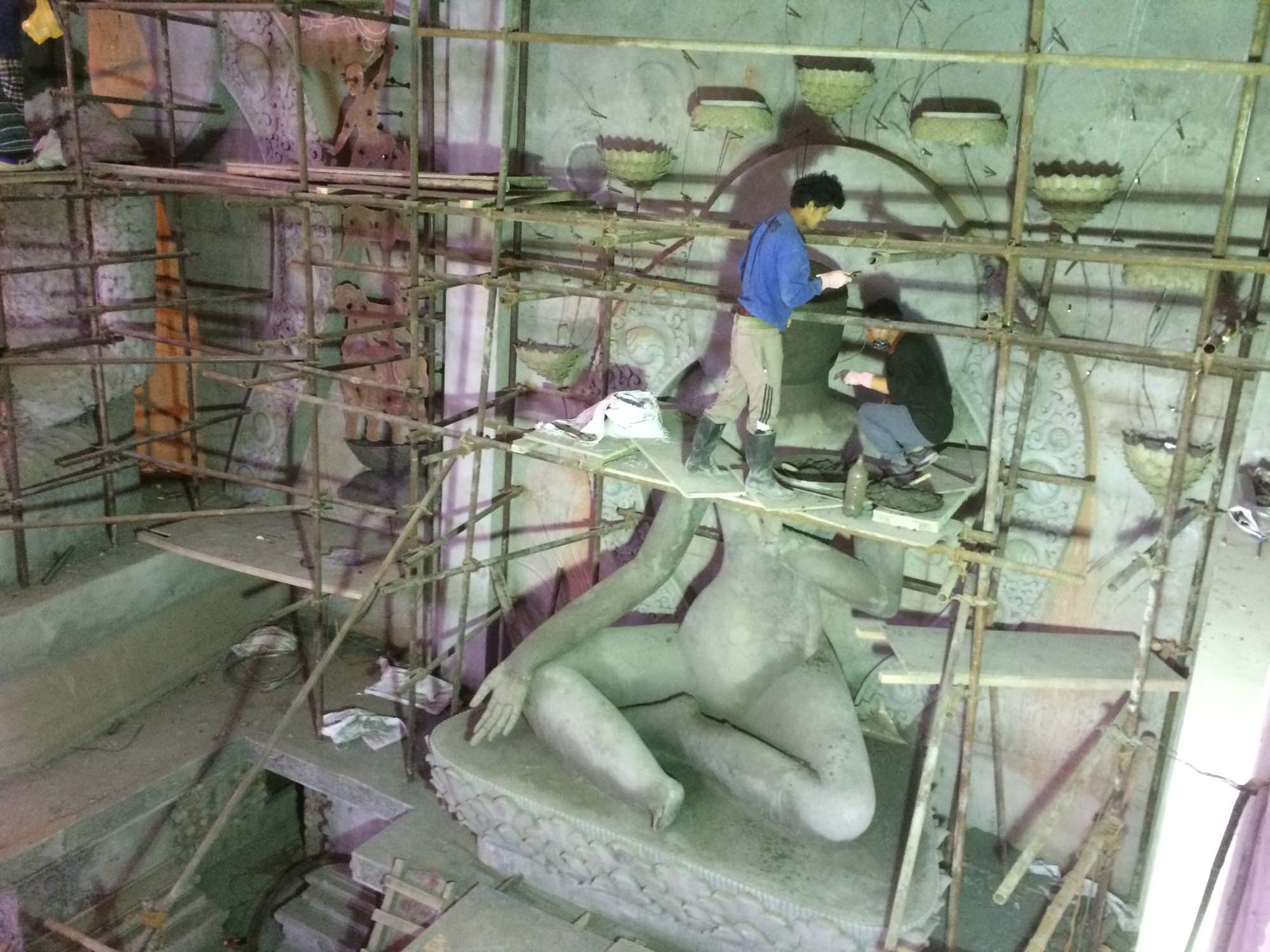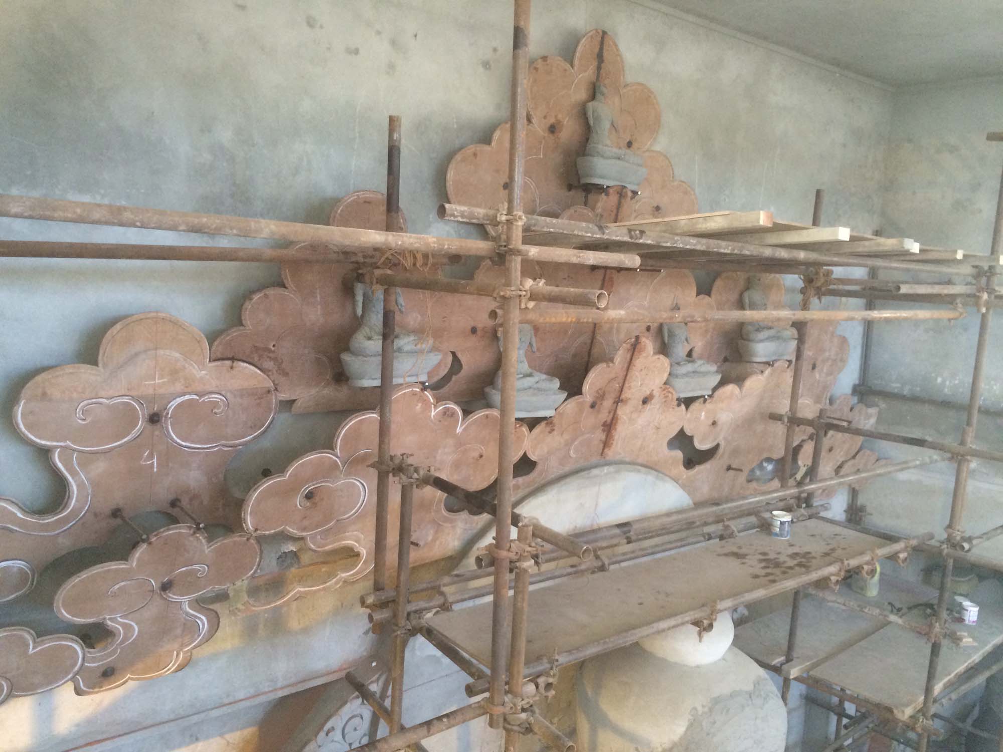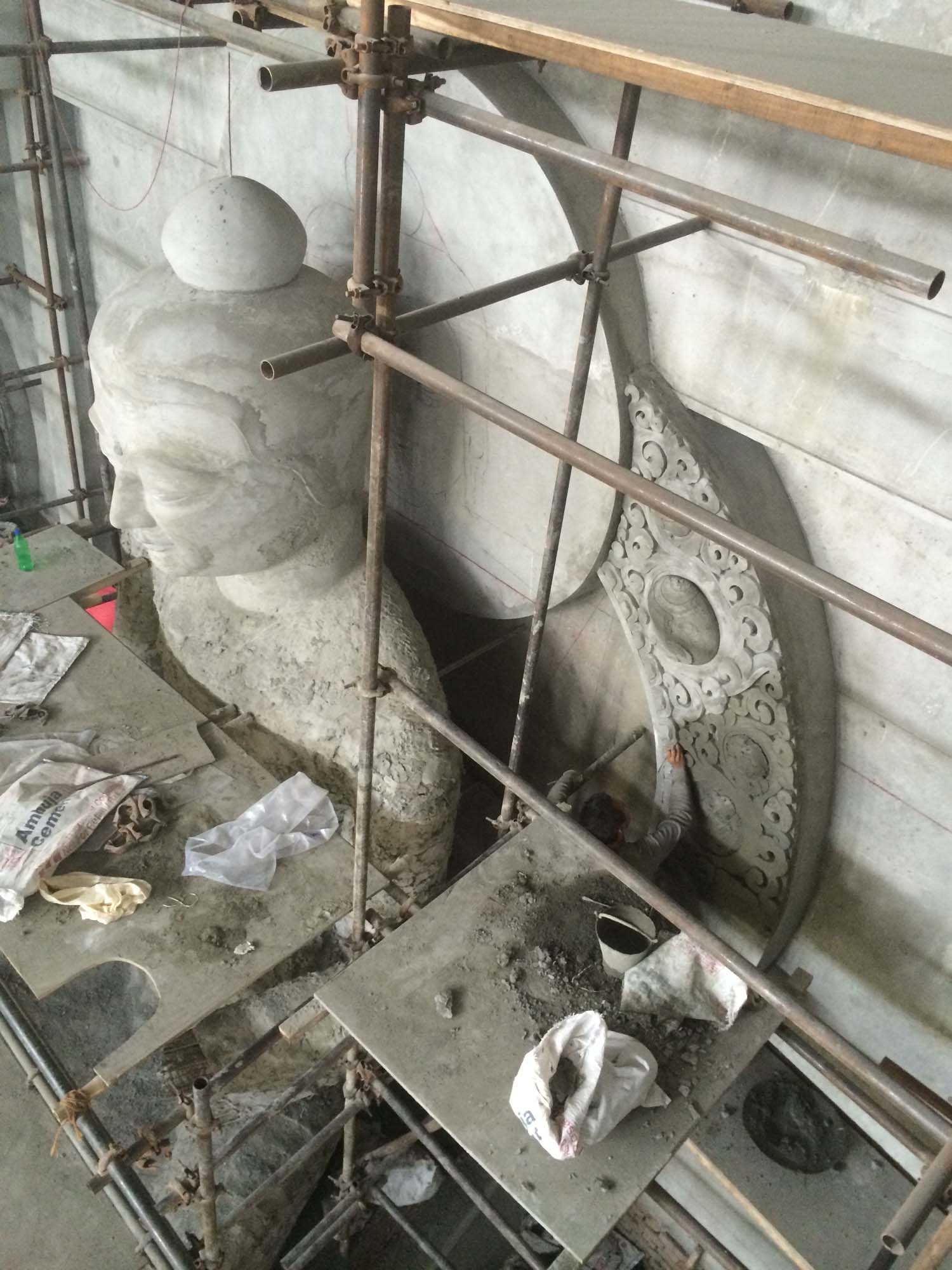 At the most center of the temple rises a 38-foot statue of the master of the teachings—the Teacher, the perfect Buddha—surrounded by the seven successive generations of buddhas. To his right and left, respectively, are nine-foot-high statues of Mañjushri (the lord of sublime wisdom) and the Lord of Secrets Vajrapani (the lord of spiritual power and might). These make up the main three figures, the central one and retinue.