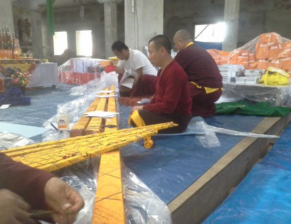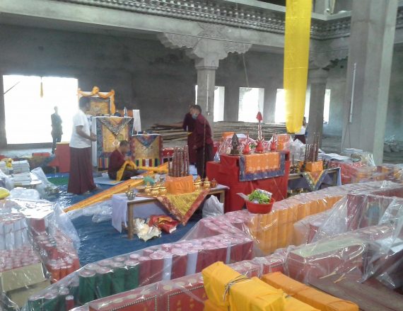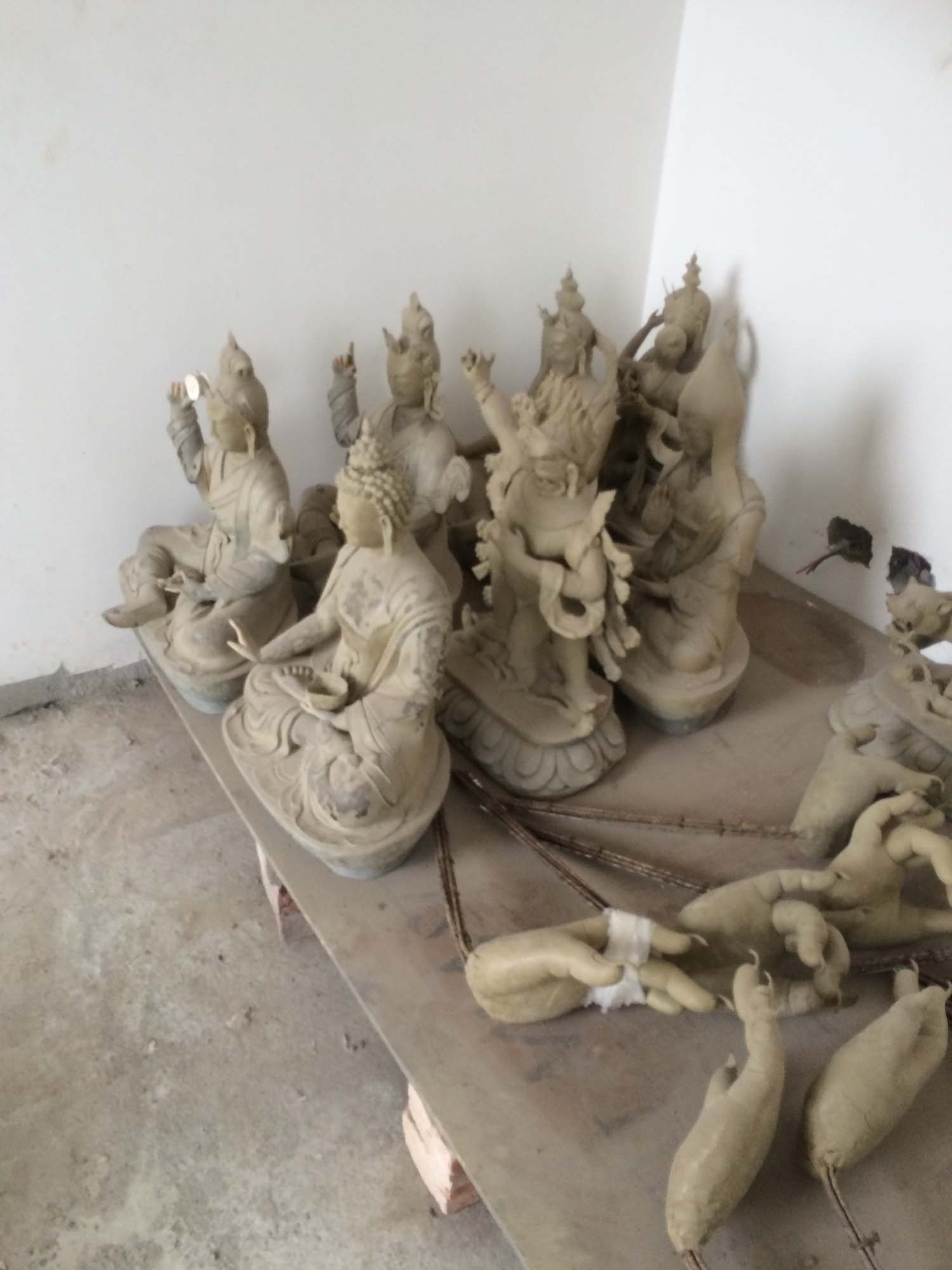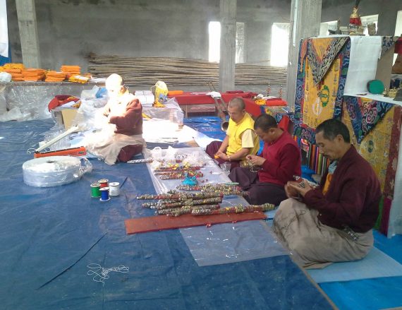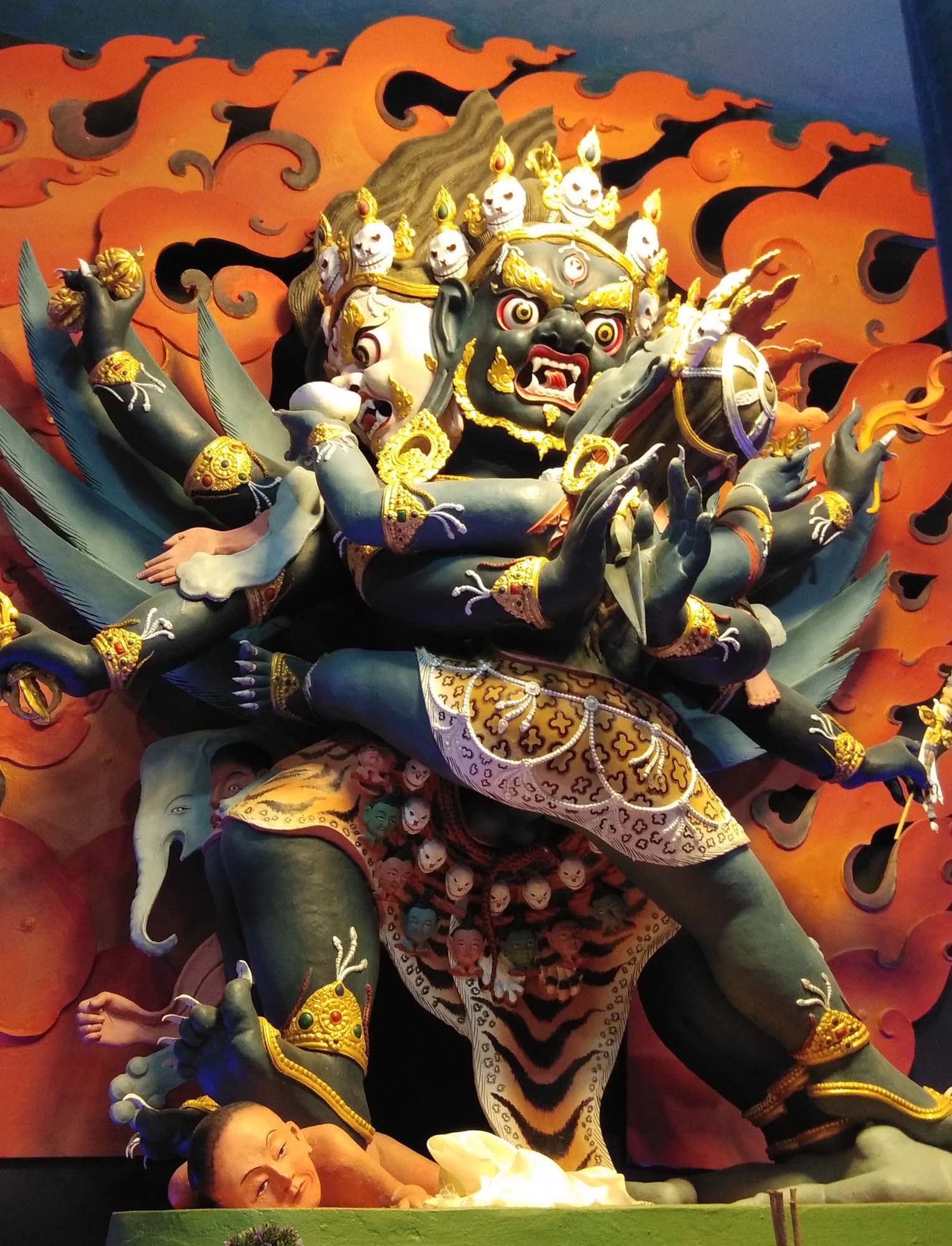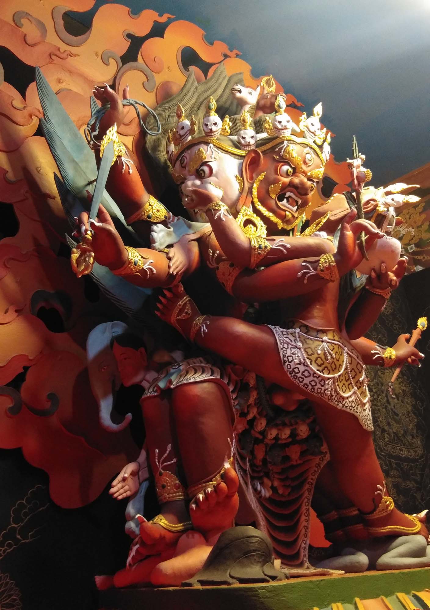 To the right and left of all of these, respectively, are a sixteen-foot-high statue of the chosen deity Vajrakumara, surrounded by the ten wrathful deities, and a sixteen-foot-high statue of sublime Hayagriva (the sovereign of supreme power), surrounded by the divine hosts of The Eight Commands on Supreme Accomplishment (Drupchen Kagyed).
