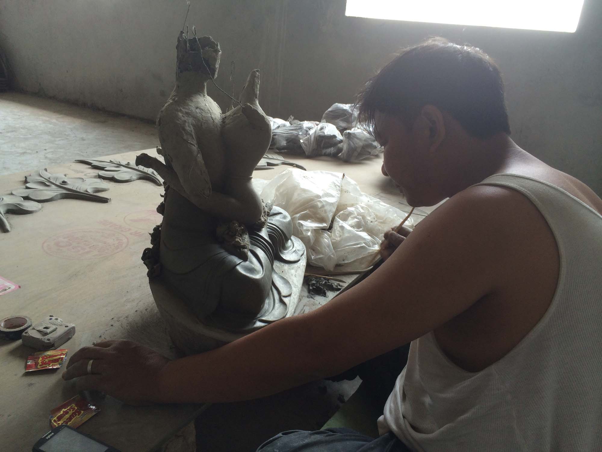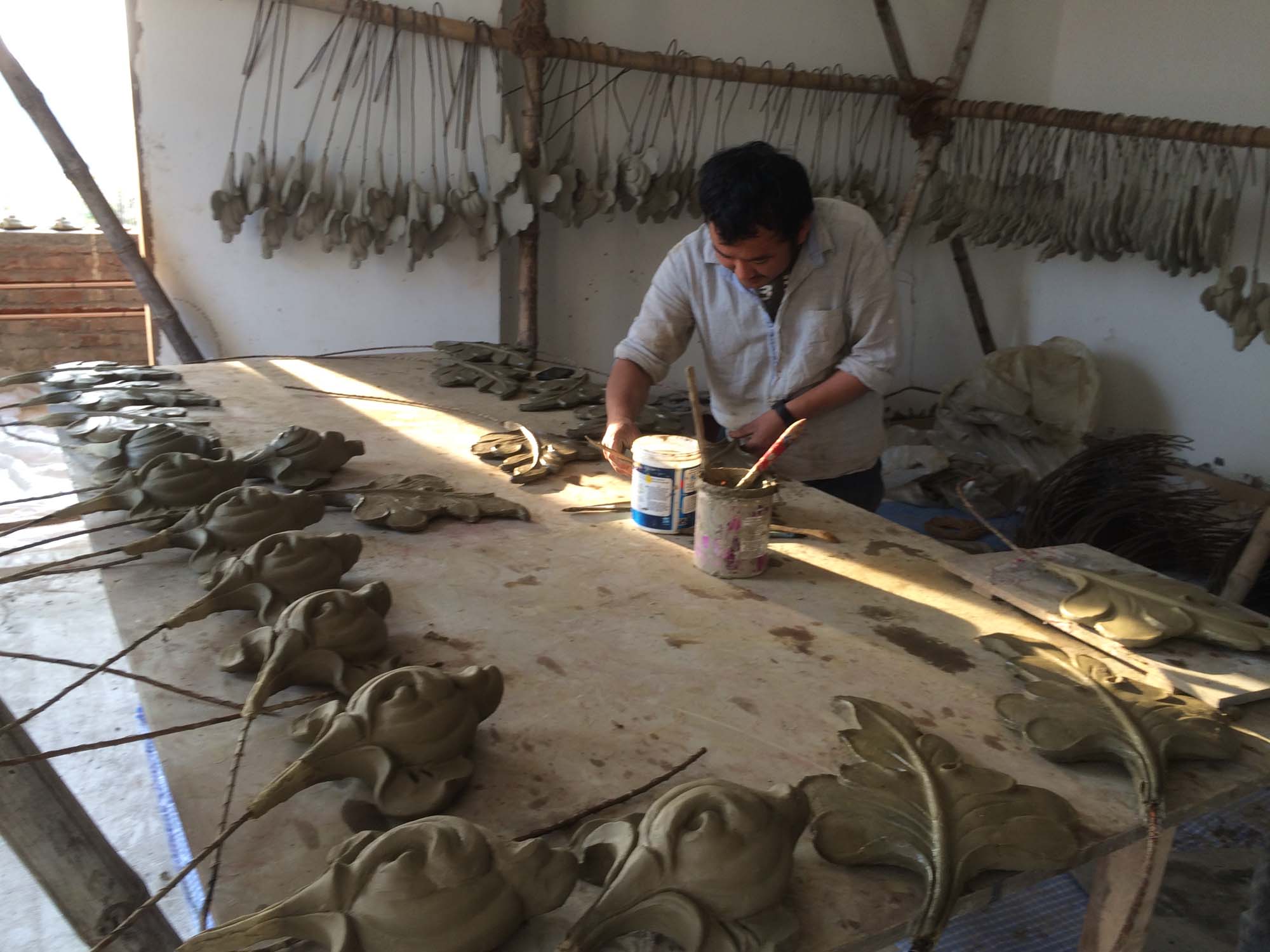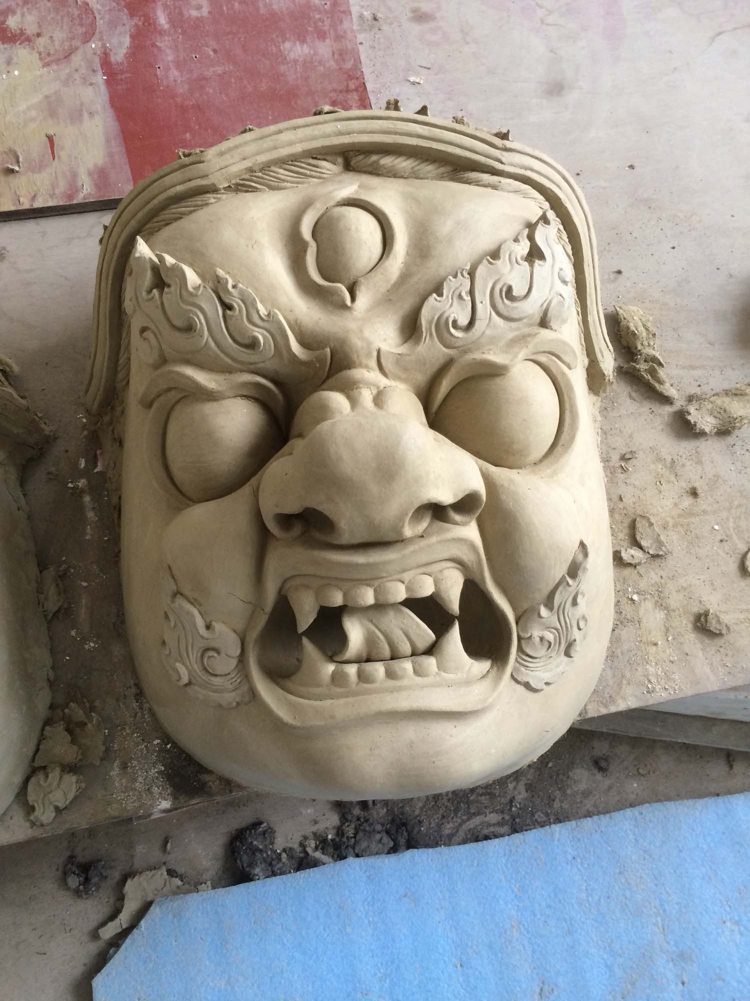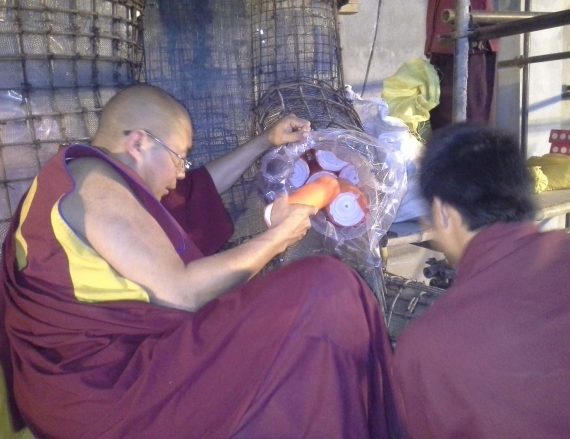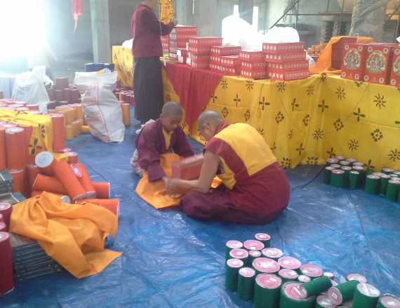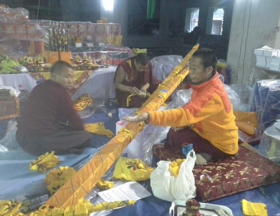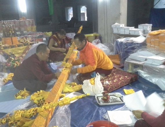 To the right and left of all of these, respectively, are a sixteen-foot-high statue of the chosen deity Vajrakumara, surrounded by the ten wrathful deities, and a sixteen-foot-high statue of sublime Hayagriva (the sovereign of supreme power), surrounded by the divine hosts of The Eight Commands on Supreme Accomplishment (Drupchen Kagyed).
