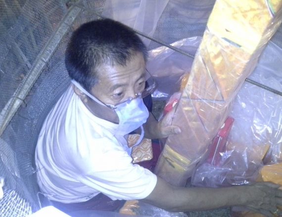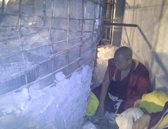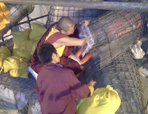 At the pinnacle on the upper floor is the temple of Amitayus, named Chimed Ngadrey Zhing-kham (“Pure Realm of the Drumbeat of Immortality”). Within this are depictions of the primary deity—the lord protector Amitayus—with the host of deities of the Namchak cycles Overwhelming the Lord of Death with Splendor (Chidak Zilnön) and Longevity Practice: The Iron Knot (Tsedrup Chakkyi Gyadüd), as well as those of The United Intent of the Three Kayas (Kusum Gongdü) and the lineage lamas and custodians who have upheld the Namchak tradition.